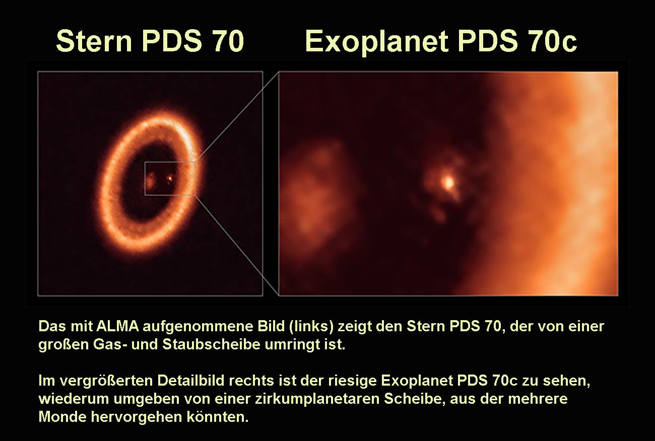 Zwar kein Exomond, aber die Vorstufe davon wurde nun mit dem Atacama Large Millimeter/ Submillimeter Array (ALMA) in einem fast 400 Lichtjahre entfernten Sternsystem entdeckt: Astronomen haben zum ersten Mal eindeutig eine Scheibe um einen Exoplaneten nachgewiesen. Die Beobachtungen könnten neue Erkenntnisse darüber liefern, wie sich Monde und Planeten in jungen Planetensystemen bilden.
